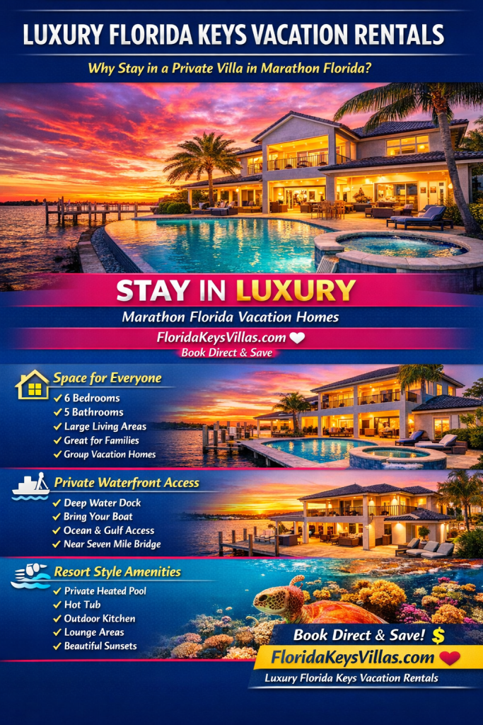 If you're looking for the top vacation destinations in Marathon Florida, you'll find beautiful beaches like Sombrero Beach, iconic views from Seven Mile Bridge, snorkeling at Sombrero Reef, and luxury waterfront vacation rentals with pools and docks at FloridaKeysVillas.com where you can book direct and save.