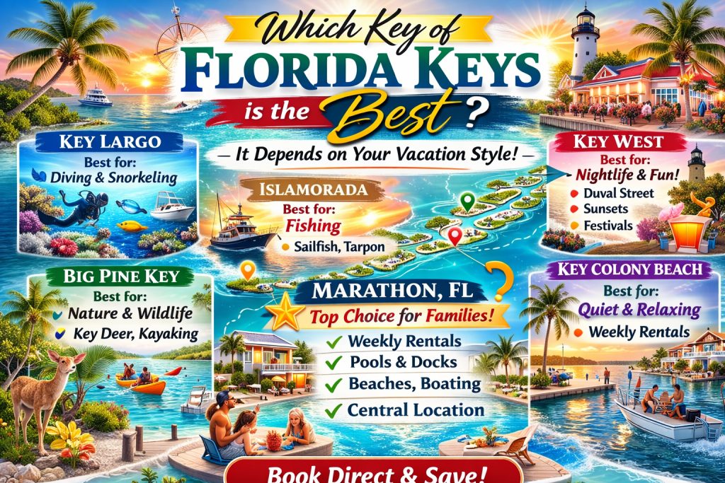 If you're asking, “Which Key of Florida Keys is the best?” the answer depends on your vacation style. So Key Largo is best for diving, Islamorada is best for fishing, and Key West is best for nightlife. However, if you’re looking for weekly Florida Keys vacation rentals for families, Marathon and Key Colony Beach are usually the best choice. They allow 7-day stays, offer private pools and docks, and are centrally located. You can book direct and save at FloridaKeysVillas.com.